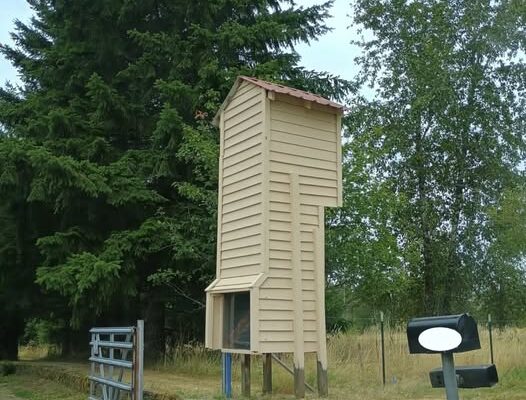 Drivers traveling a quiet rural road north of Gresham, Oregon, often notice a tall, slender wooden tower standing at the end of a driveway. About 15 feet high, the structure features beige siding, a small pitched roof, and a lower glass panel facing the driveway. It’s not a deer feeder, treehouse, or mailbox—it’s something far more inventive.