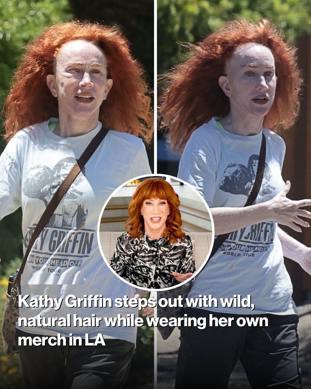 Kathy Griffin was photographed showing off her wild, natural hair and brand merch as she stepped out for a walk on Tuesday.